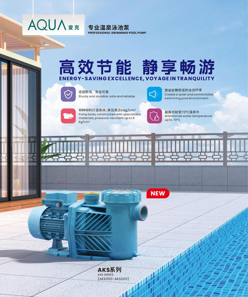 值得关注的是,品牌近期推出新品AKS系列,作为专业温泉泳池泵,在性能上同样出色:流量较普通水泵更大、吸力更强,可实现高效稳定的水循环,同时产品可耐受最高70℃温泉水,辅以静音设计与稳定结构,真正实现高效、安全与静谧的卓越体验。