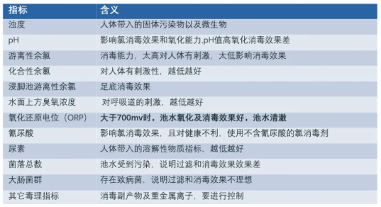 水质指标的意义我们一直都在强调,关于不同指标所对应的含义是什么可能有很多人不太清楚,比如浊度,浊度是指人体带入的固体污染物以及微生物,但是浊度不仅仅是一个感官指标,它也是一个卫生学的指标。再比如臭氧浓度,臭氧对呼吸道有刺激,浓度越低越好。从工艺上讲,现在我们国家的标准是分流量全程式臭氧消毒,这种消毒系统具有代表性的案例就是水立方,把三分之一的水流经臭氧反应,反应完以后再经过活性炭,就可以保证消毒后的水里面是没有臭氧的。此外,还有氰尿酸,在婴幼儿泳池的用水中要使用不含有氰尿酸的氯消毒剂,因为氰尿酸影响氯消毒效果,且对健康不利,因此,婴幼儿泳池用水的水质中氰尿酸的含量应为0。(其他指标及含义,可参考图2)